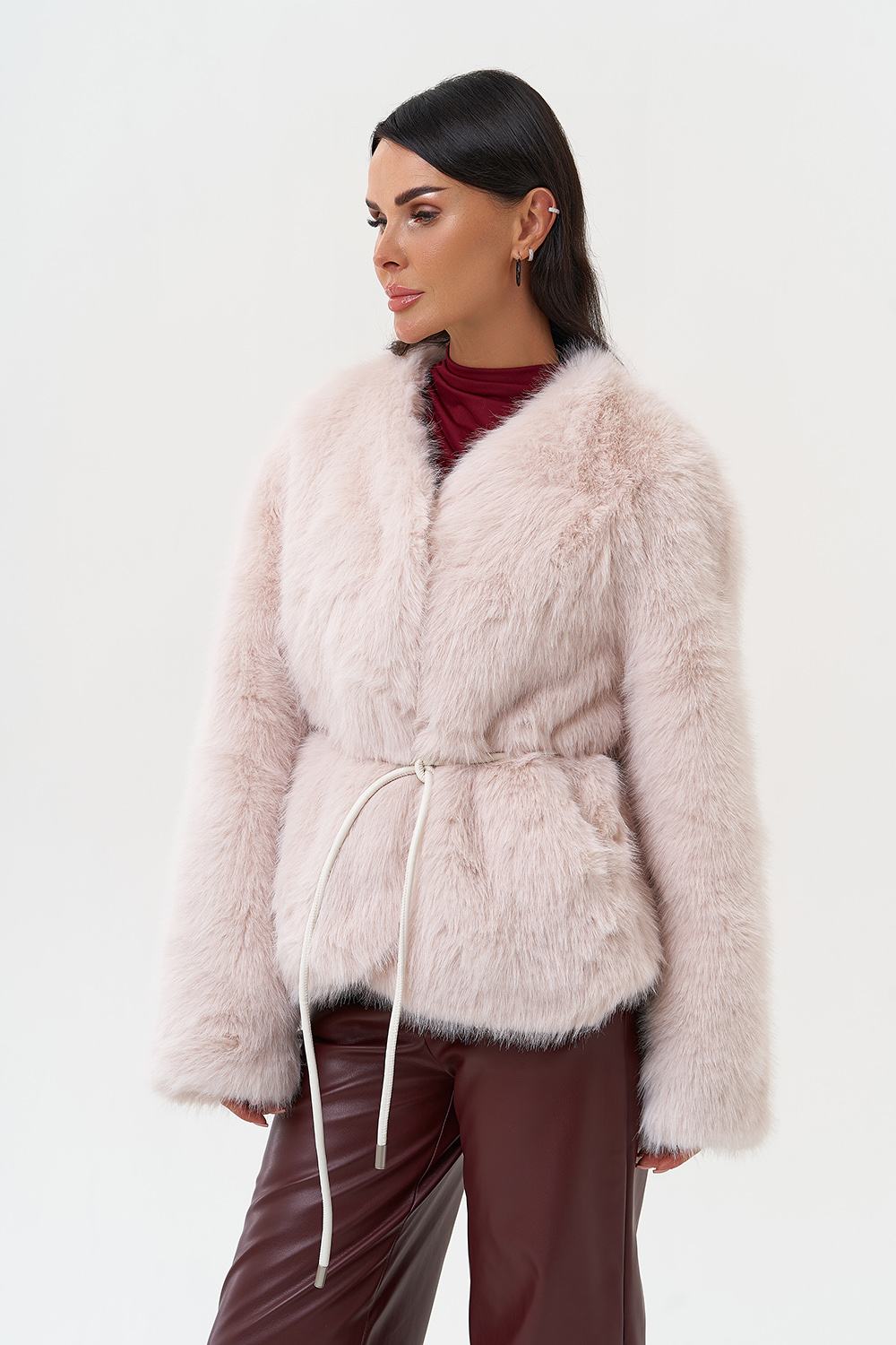 Фасон - прямой Длина изделия - 60 см Цвет - розовый (персиковый) Материал - экомех Состав полотна - полиэстер 100% Подкладка - полиэстер 100% Вид застежки -крючки, пояс Вид ворота - V-образный Фасон рукава - спущенное плечо, длинный |